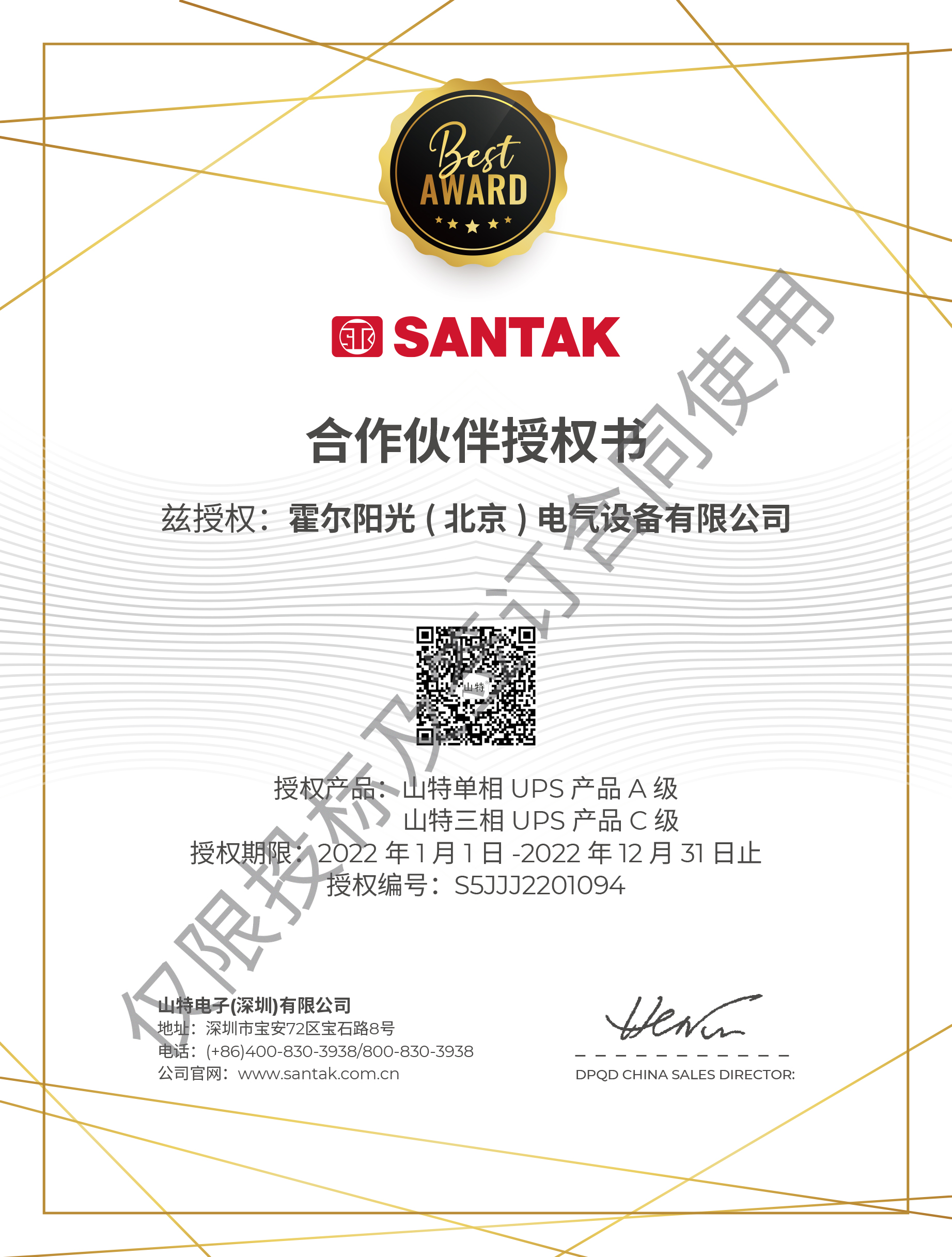 2022年1月,我司(霍爾陽光(北京)電氣設(shè)備有限公司)與續(xù)簽約成為山特中國區(qū)A級合作伙伴。授權(quán)證書編號S5JJJ2201094